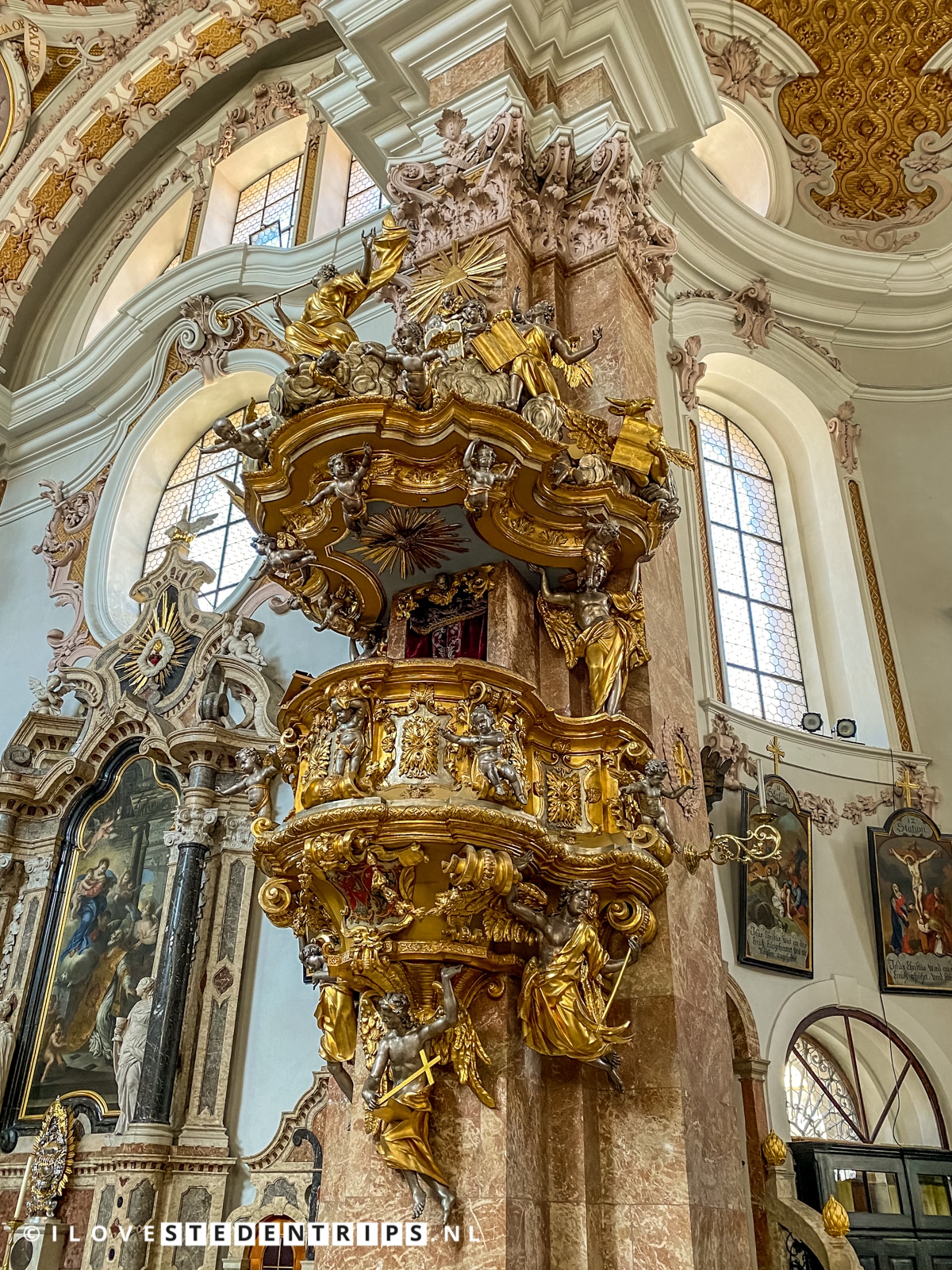 Nikolaus Mills in 1724. Deze vergulde kansel wordt ondersteund door de goddelijke deugden: Hoop (engel met anker), Geloof (engel met kruis) en Liefde (engel die naar hart wijst).