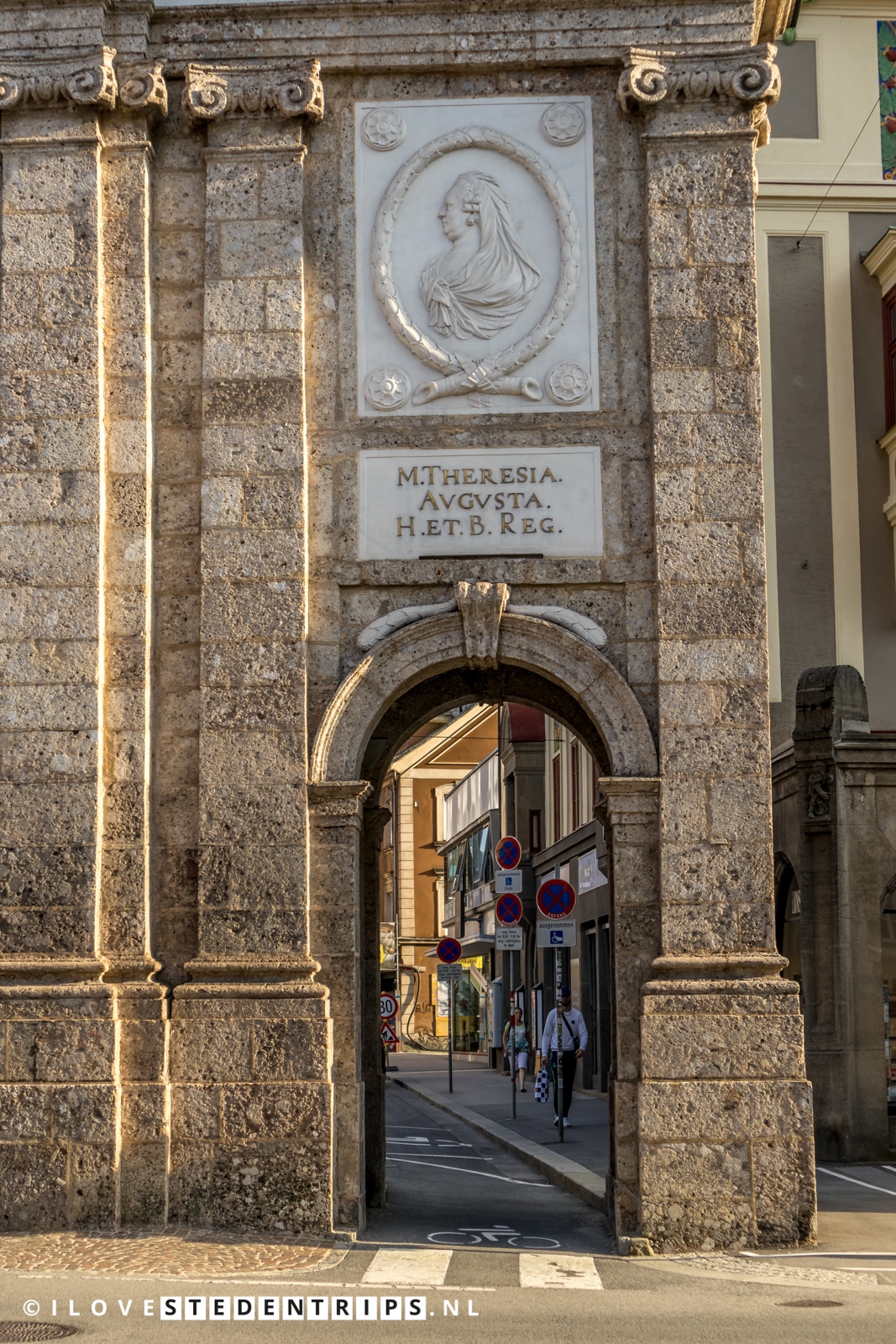 In het centrum van Innsbruck, aan zuidelijke kant van de Maria-Theresien-Straße, kom je een enorme triomfpoort tegen. Deze Triumphpforte, zoals hij in het Duits genoemd wordt, werd in 1765 gebouwd in opdracht van keizerin Maria Theresia. De aanleiding voor de bouw van deze enorme poort was het huwelijk, op 5 augustus 1765, van haar tweede zoon aartshertog Leopold en de Spaanse prinses Maria Ludovica. Hoewel de aanleiding voor de bouw het huwelijk was kreeg de poort later ook een plechtige betekenis want tijdens de huwelijksfeesten stierf Franz Stephan von Lothringen, de echtgenoot van keizerin Maria Theresia, op 18 augustus 1765.